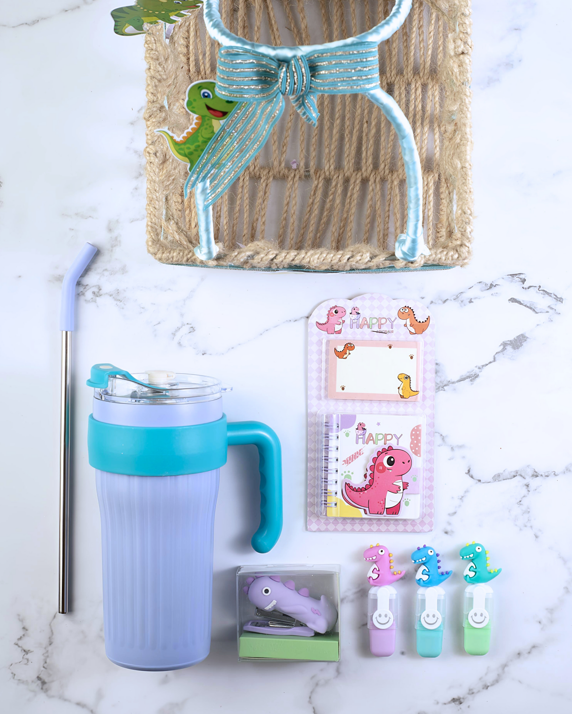 Fuel their imagination and study space with this adventure-packed hamper! Bursting with cute dinos, practical stationery, and a stylish tumbler, it’s the perfect blend of utility and prehistoric play—ideal for return gifts, birthdays, or just-because surprises.